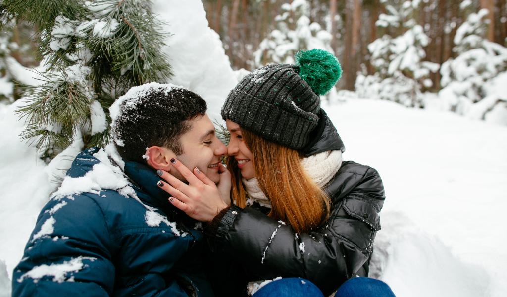 Wallpaper Couple in love sitting under a snowy fir branch in winter