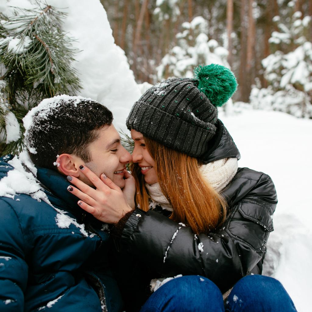 Wallpaper Couple in love sitting under a snowy fir branch in winter