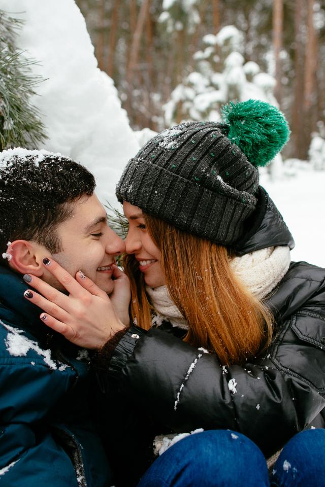 Wallpaper Couple in love sitting under a snowy fir branch in winter
