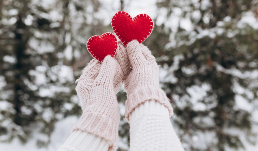 Wallpaper Two red fabric hearts in the hands of a girl