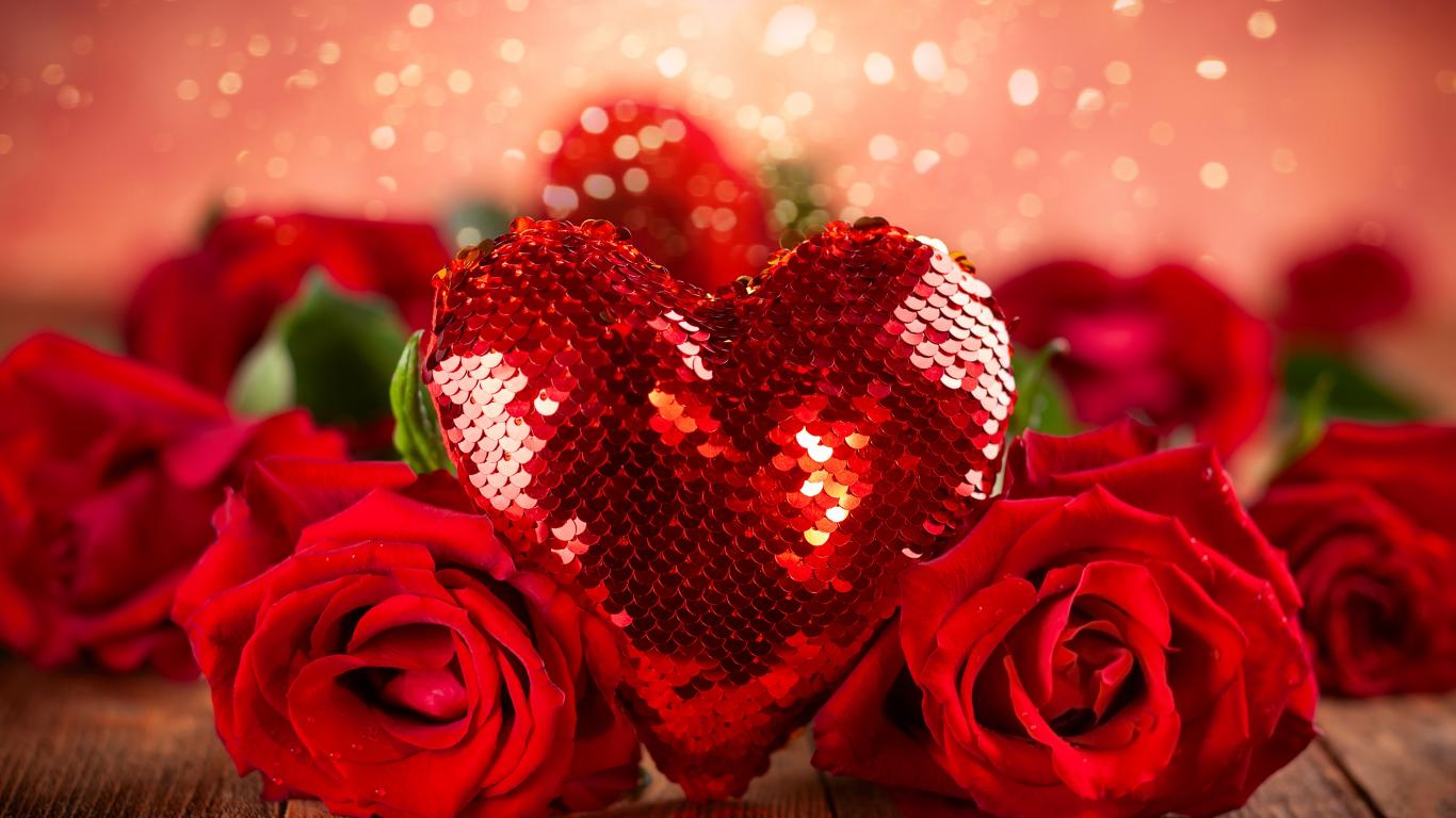 Wallpaper Big red shiny heart with a bouquet of roses