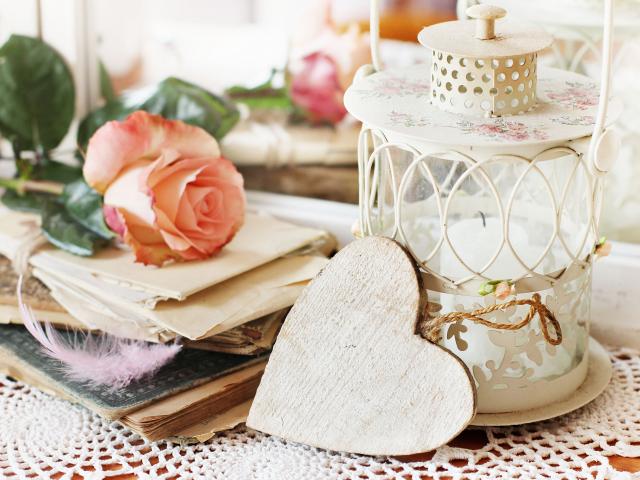 Wallpaper Lantern with candles on the table with a rose, heart and books