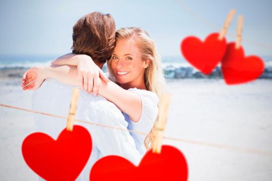 Wallpaper Loving couple with red hearts on the ocean