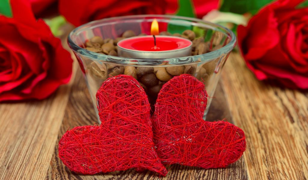 Wallpaper Two red wicker hearts on a table with a burning candle