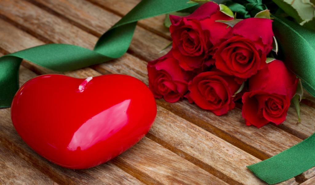 Wallpaper Big heart on a wooden table with a bouquet of red roses