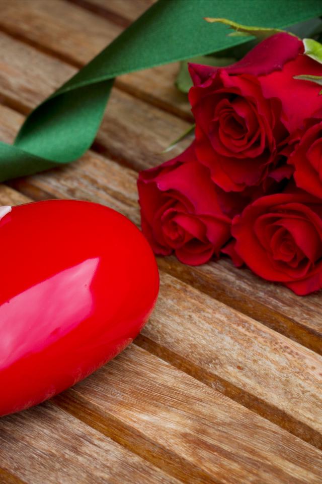 Wallpaper Big heart on a wooden table with a bouquet of red roses