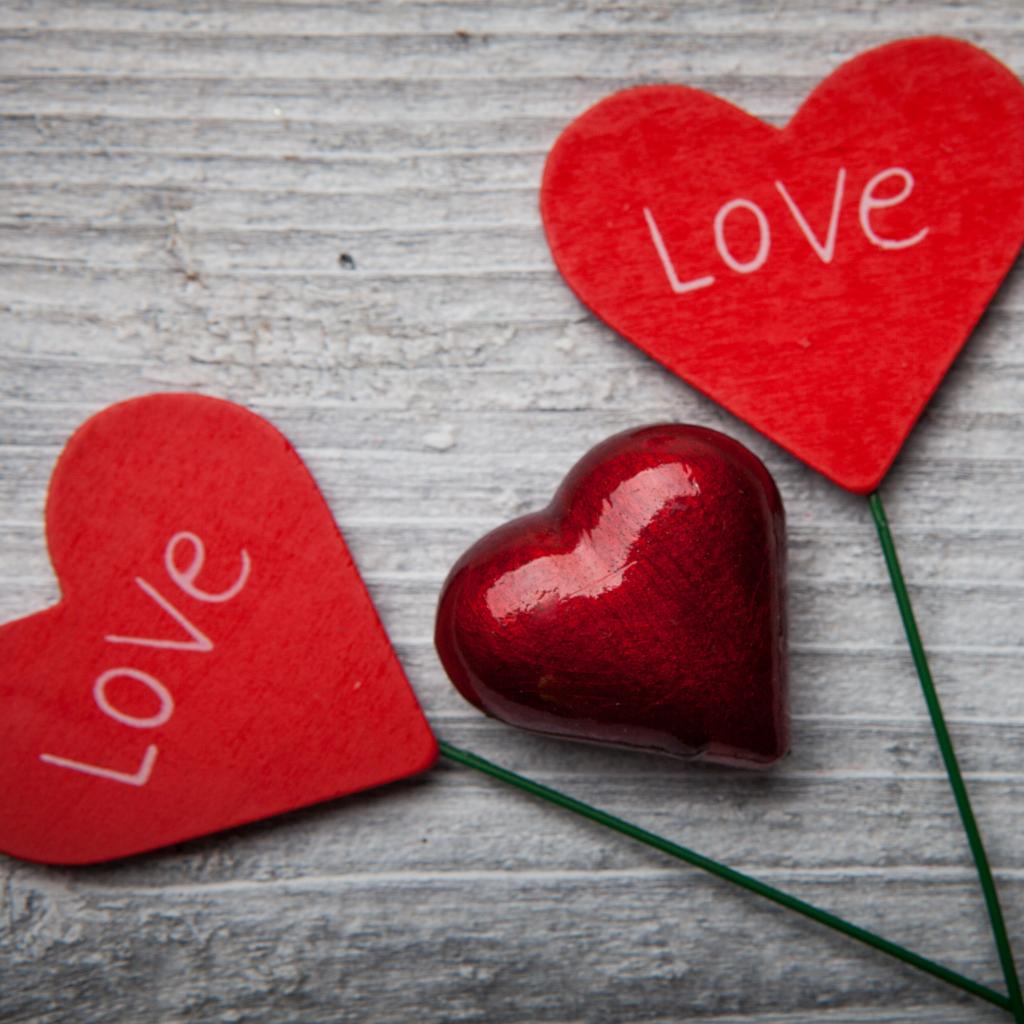 Wallpaper Two red hearts on a table with wooden hearts