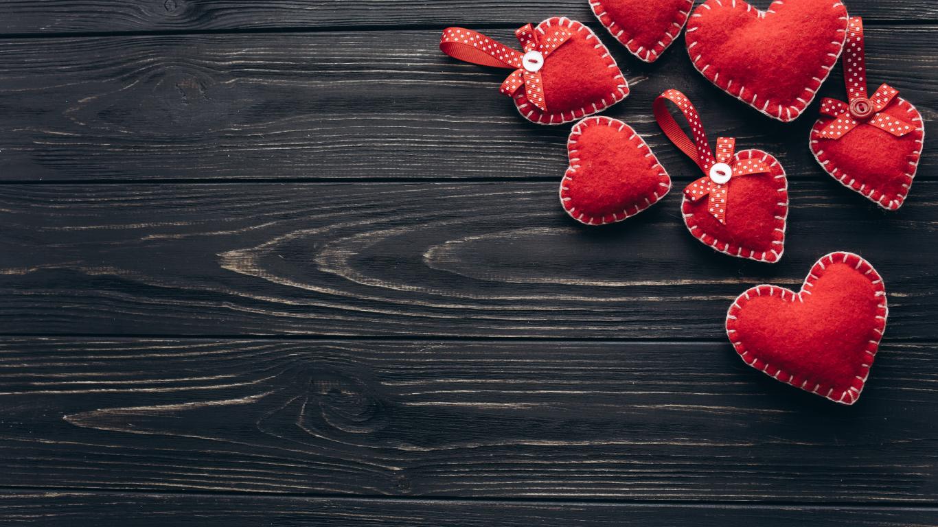 Wallpaper A lot of red felt hearts on a wooden table