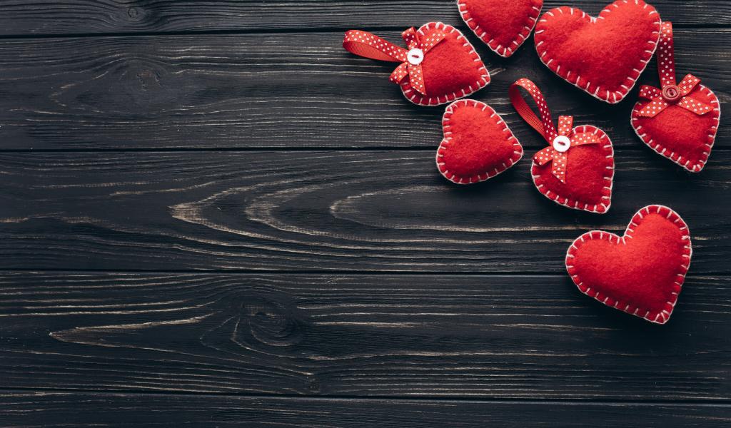 Wallpaper A lot of red felt hearts on a wooden table