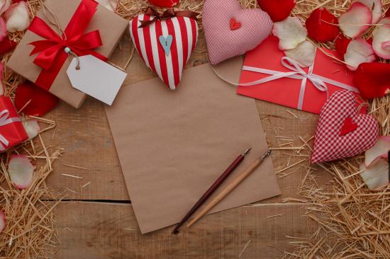 Wallpaper Fabric hearts on a table with paper and gifts.