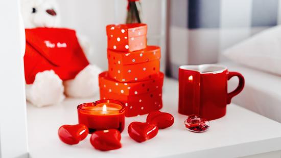 Wallpaper Cup of coffee on the table with gifts, candles and hearts.