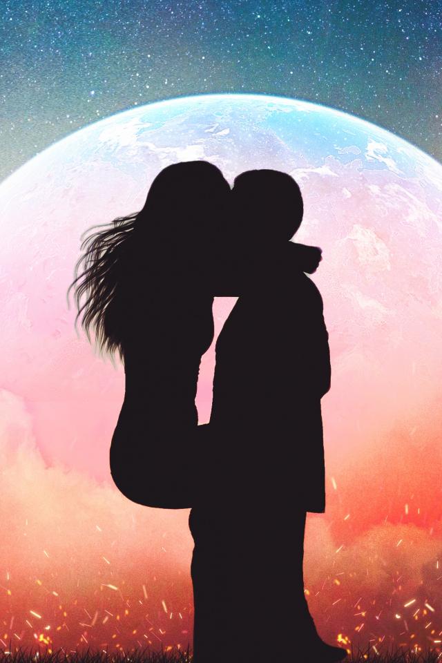 Wallpaper Kiss of a couple in love on the background of the planet at night