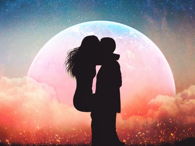 Wallpaper Kiss of a couple in love on the background of the planet at night