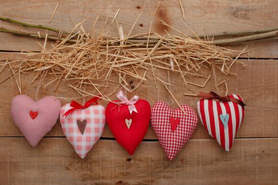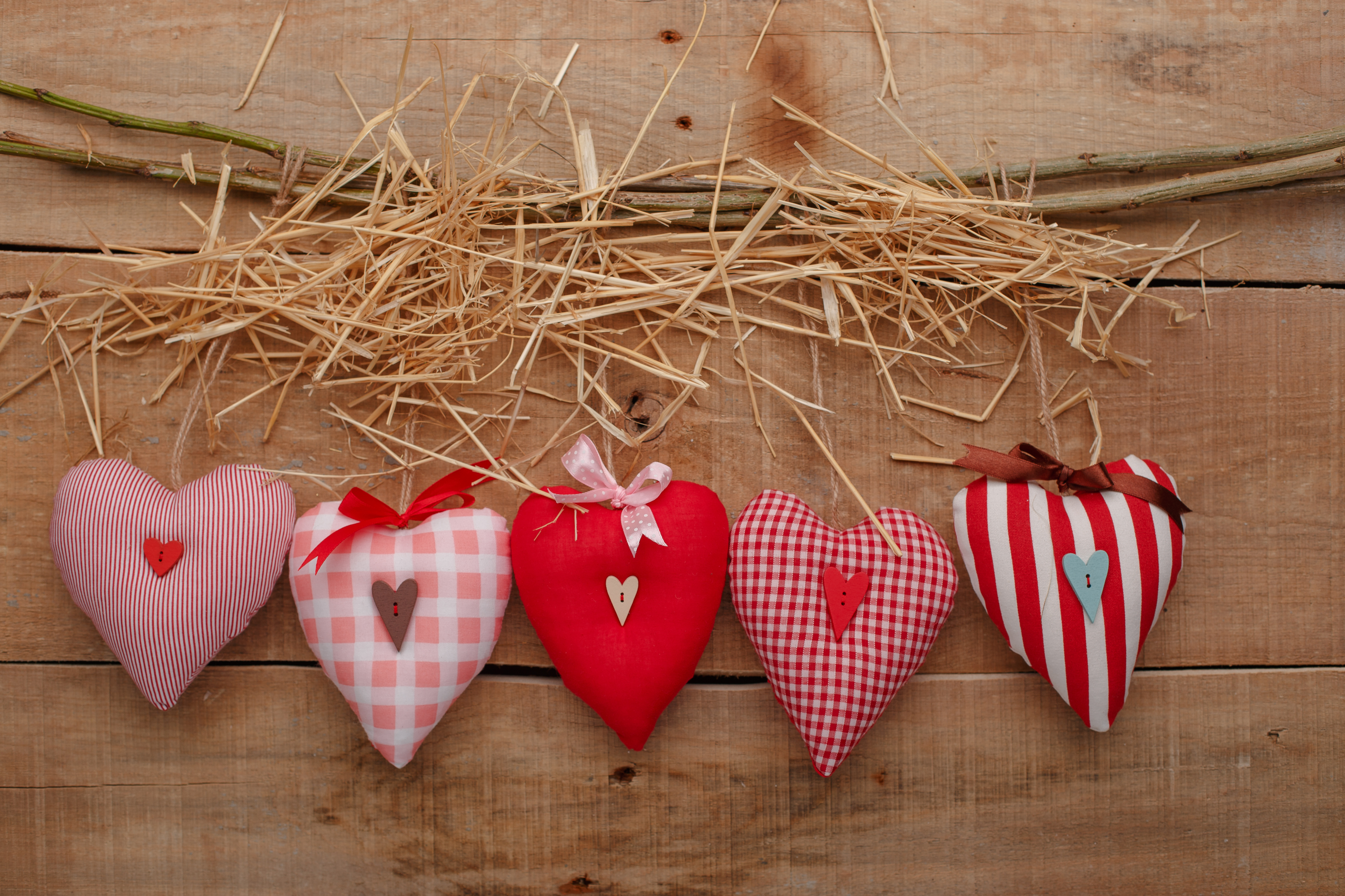 Wallpaper Fabric hearts on a table with hay and a branch