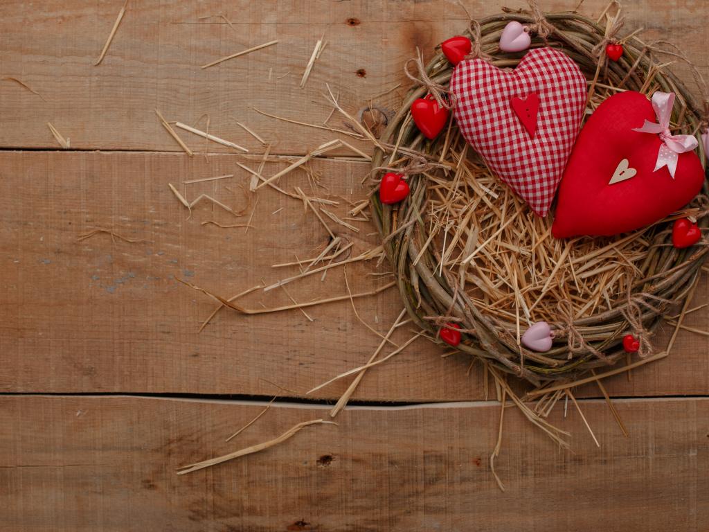 Wallpaper Two hearts made of cloth on a table in a nest