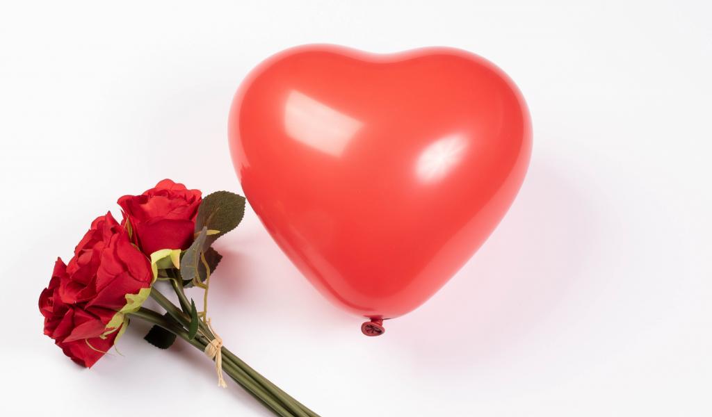 Wallpaper Red heart-shaped ball with a bouquet of roses on a white background