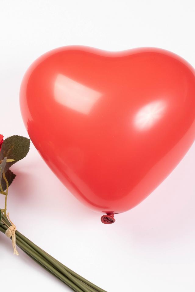 Wallpaper Red heart-shaped ball with a bouquet of roses on a white background