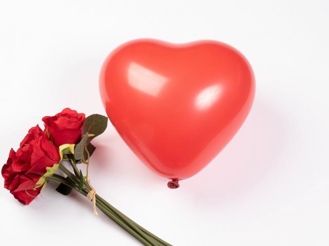 Wallpaper Red heart-shaped ball with a bouquet of roses on a white background