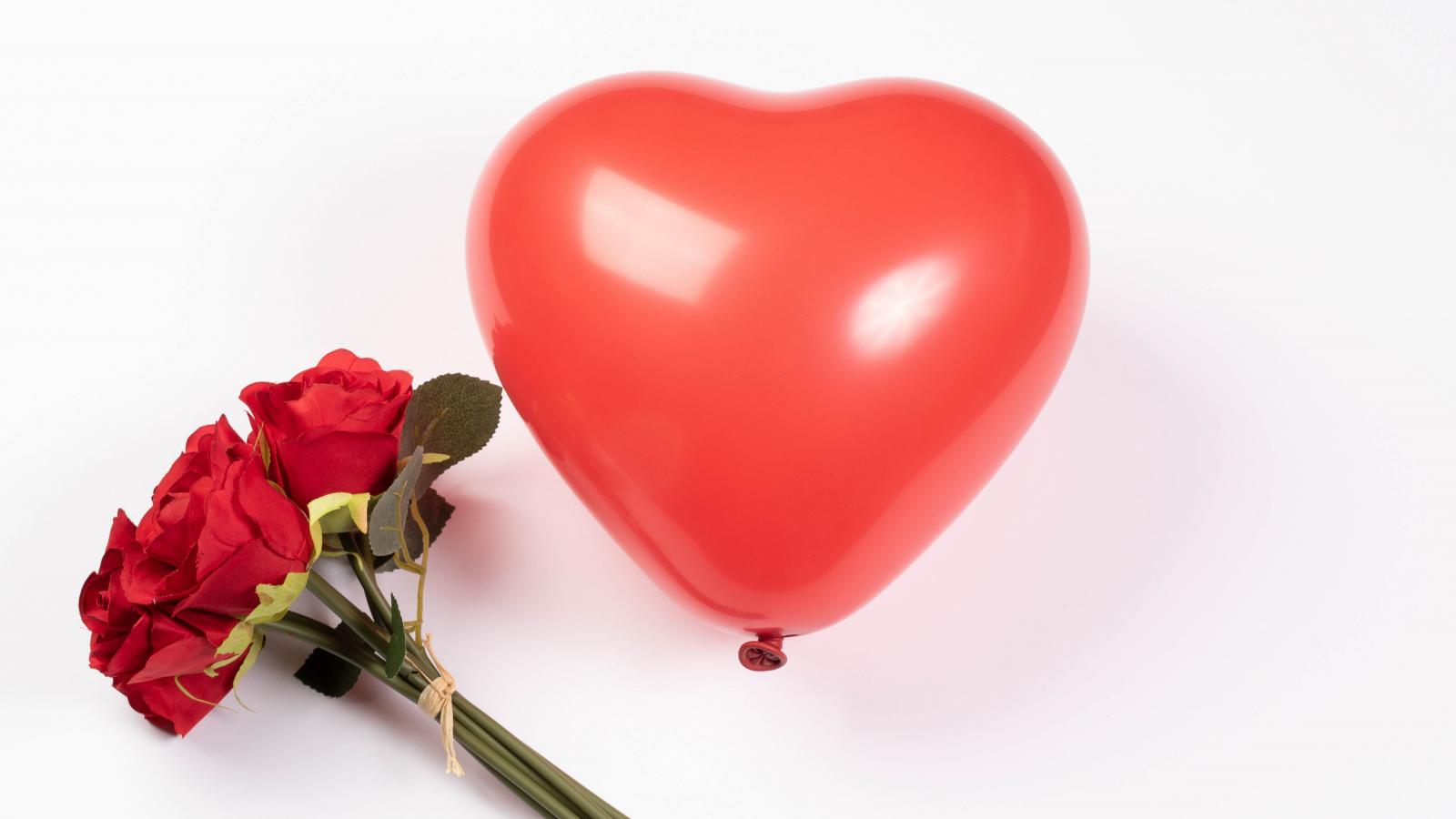 Wallpaper Red heart-shaped ball with a bouquet of roses on a white background