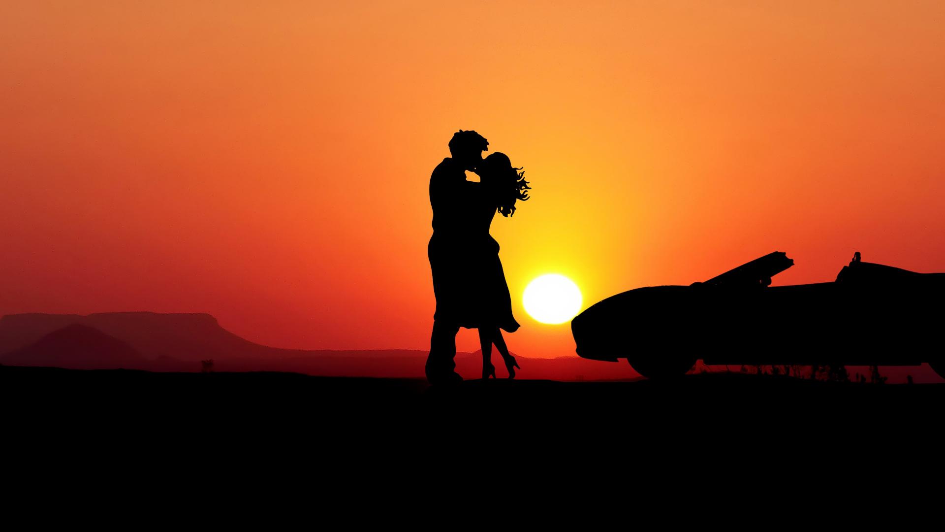 Wallpaper Kissing couple on sunset background with a car