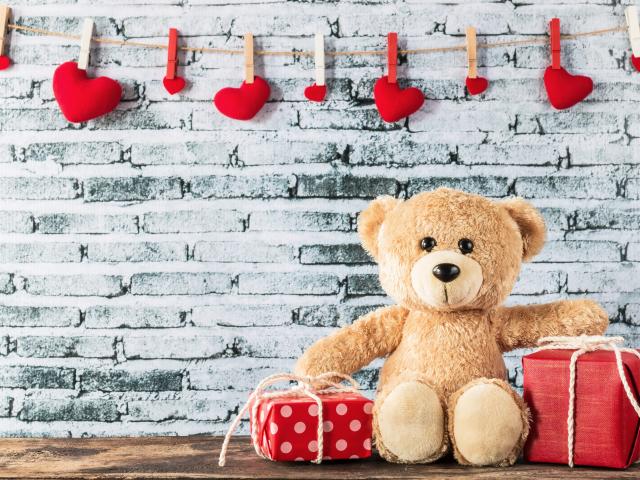 Wallpaper Teddy Bear with gifts on the background of a wall with hearts