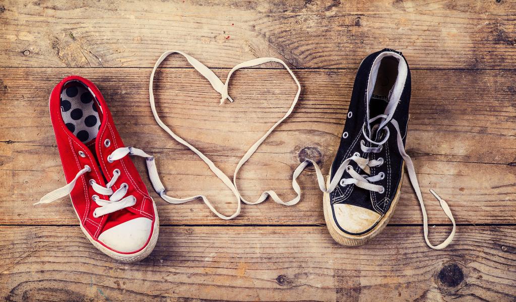Wallpaper Heart made of laces gumshoes on a wooden table