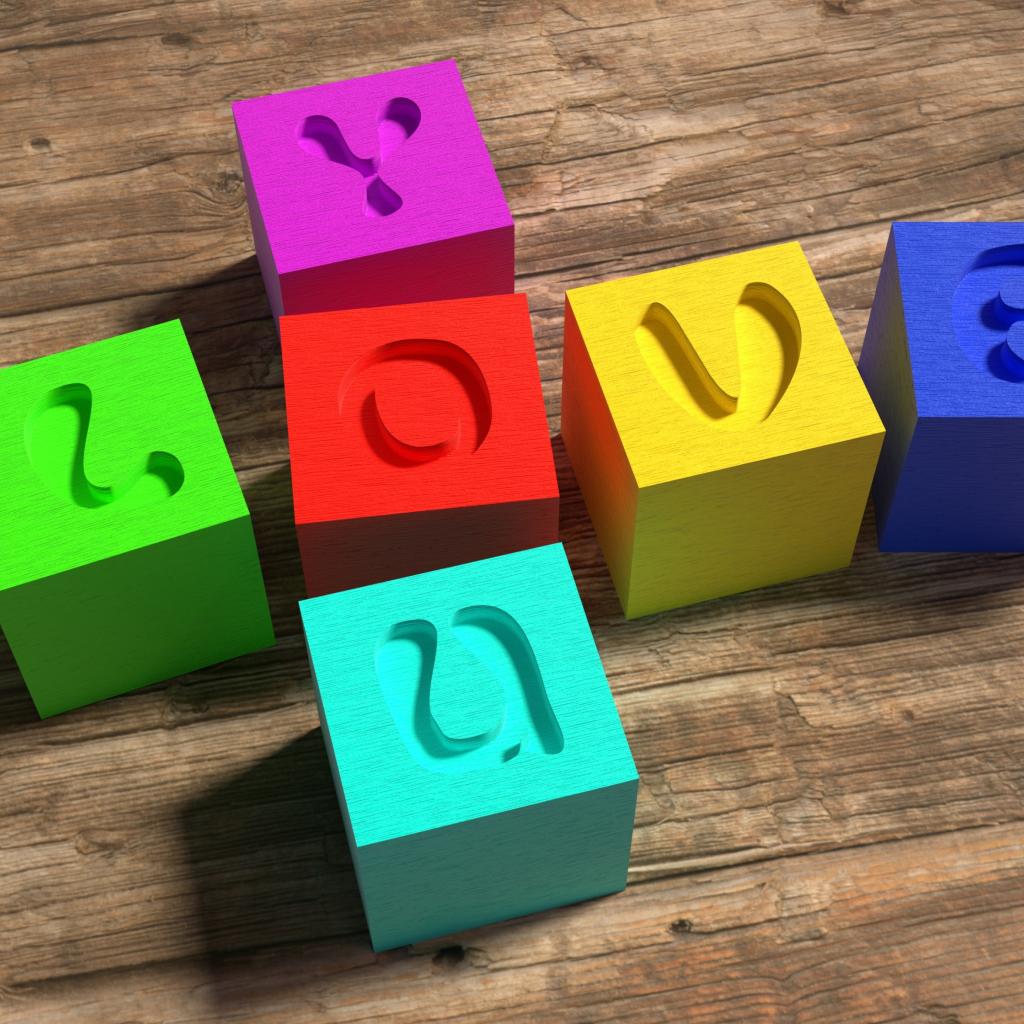 Wallpaper Multicolored cubes with the inscription Love on a wooden table