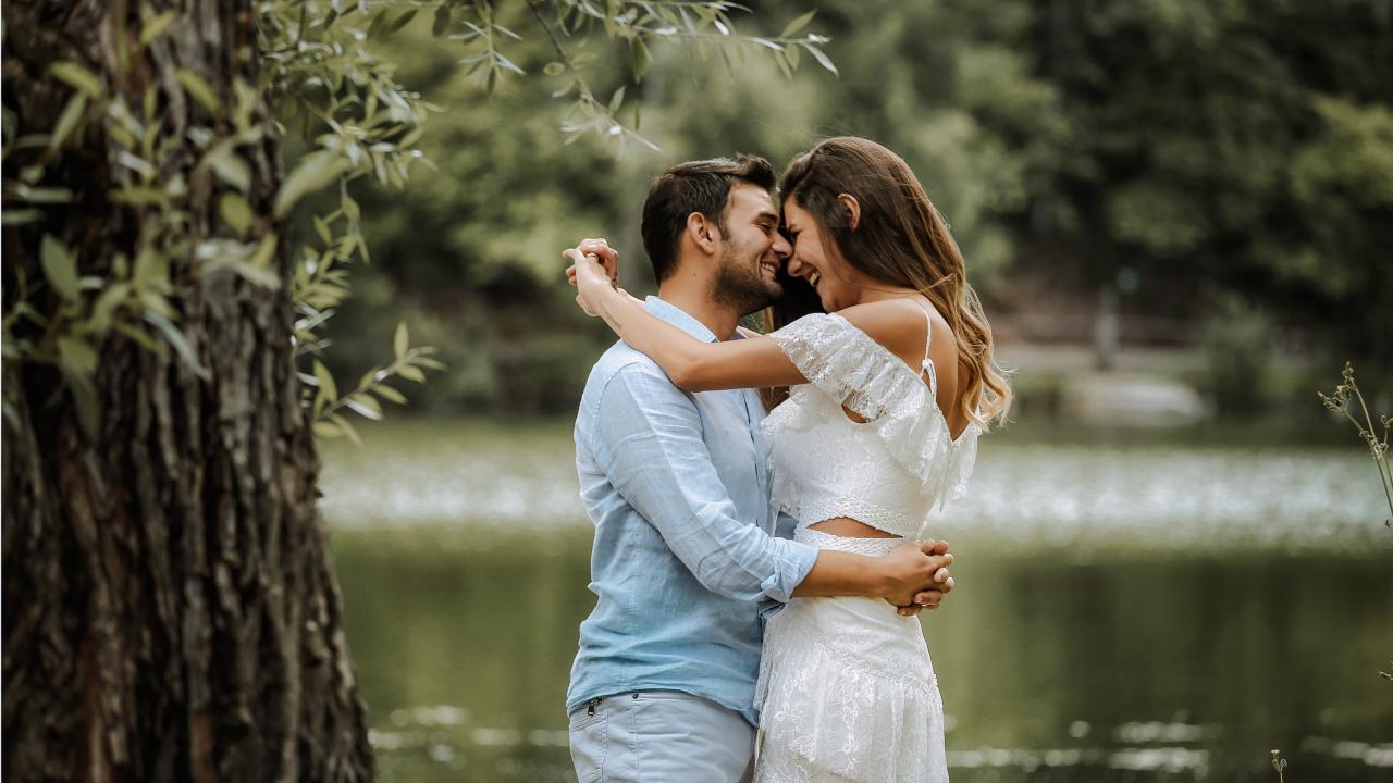 Wallpaper A loving couple stands by the pond in the park