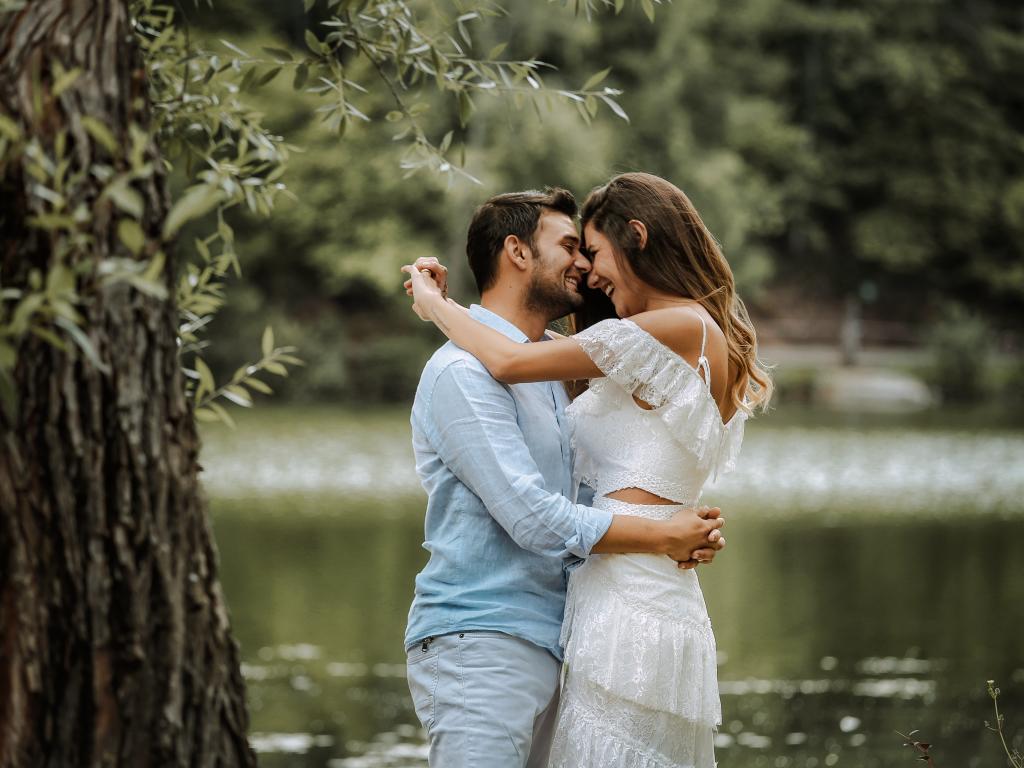 Wallpaper A loving couple stands by the pond in the park