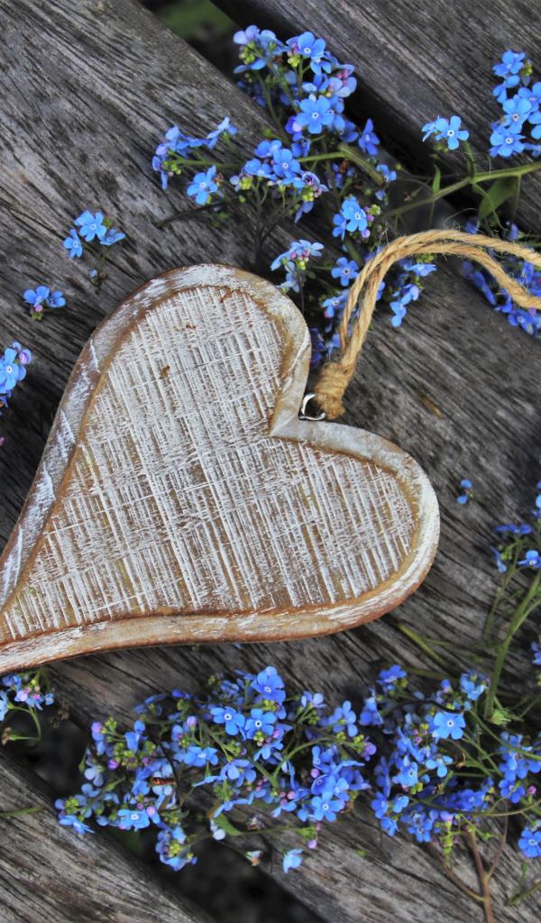 Wallpaper Wooden heart with blue forget-me-not flowers