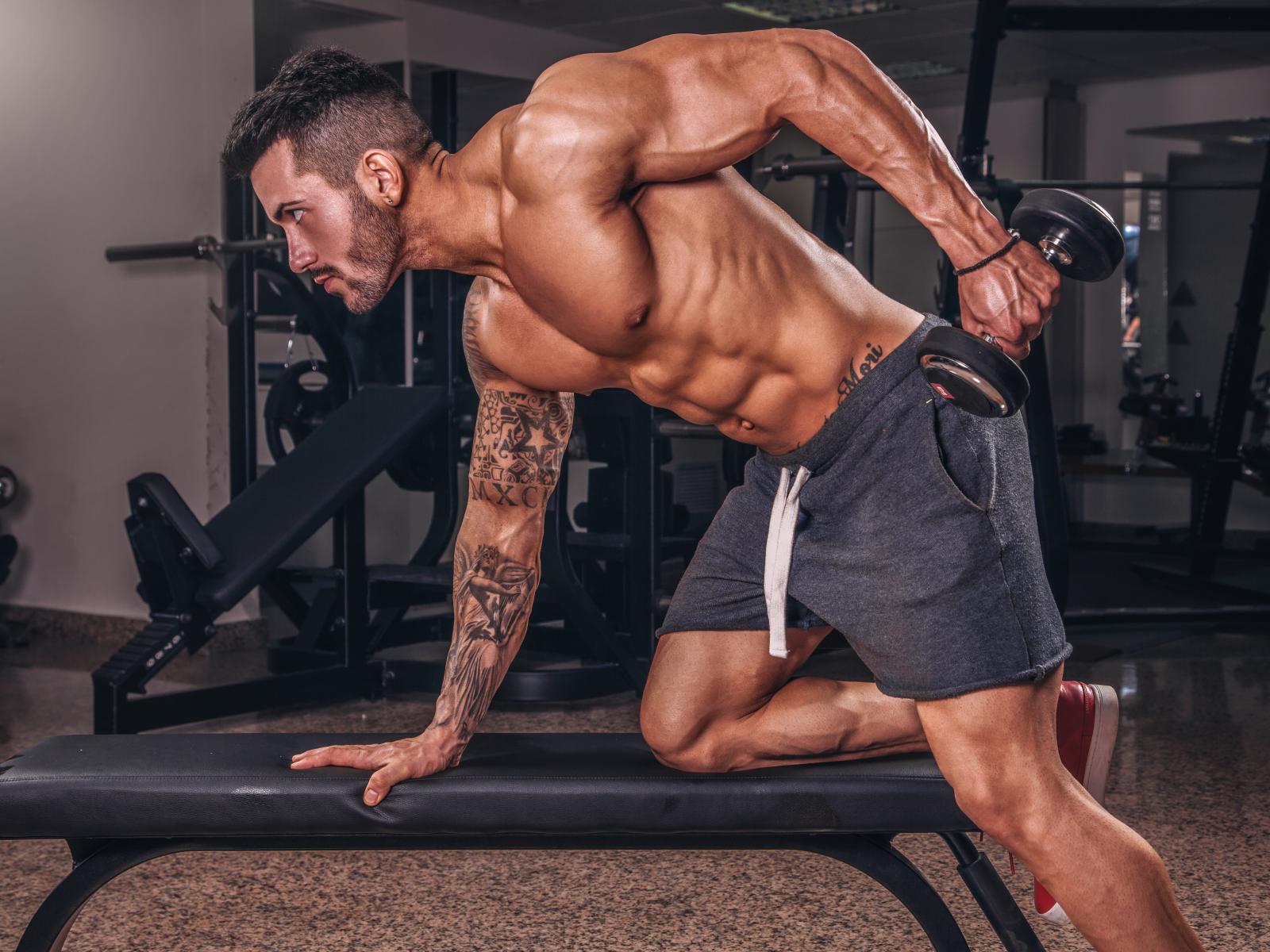 Wallpaper Muscular man engaged in the gym with a dumbbell