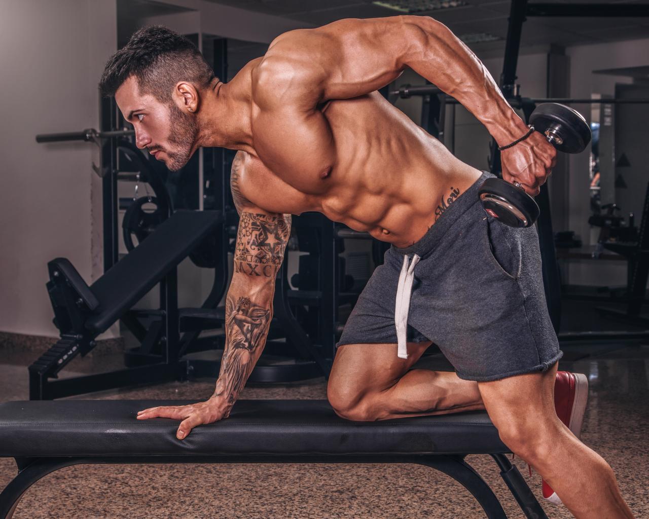 Wallpaper Muscular man engaged in the gym with a dumbbell