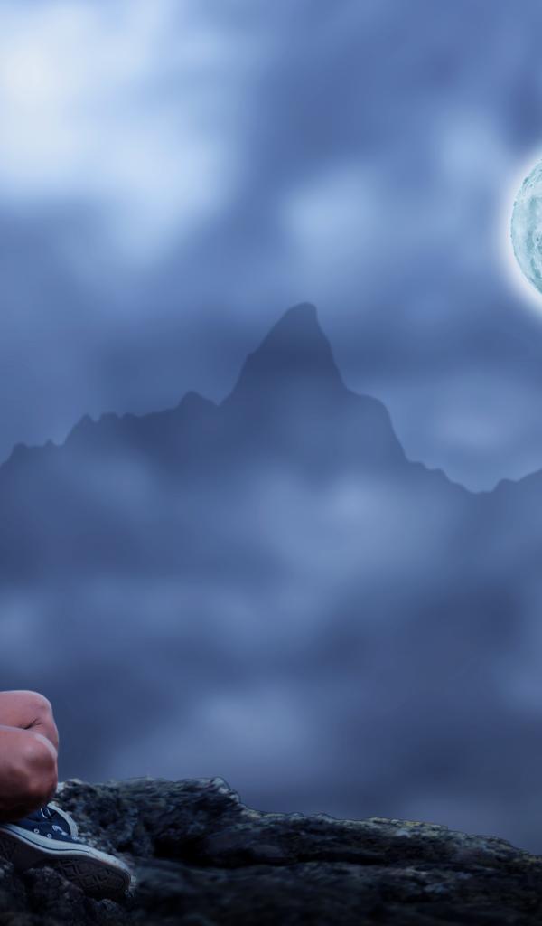 Wallpaper A man meditates on a stone at night on a full moon