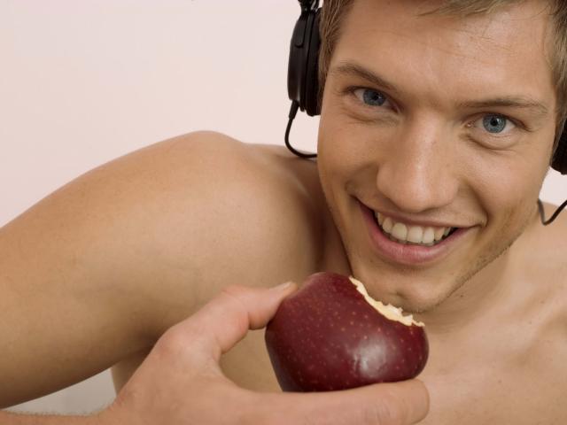 Wallpaper Handsome blue-eyed guy in headphones with an apple in his hand