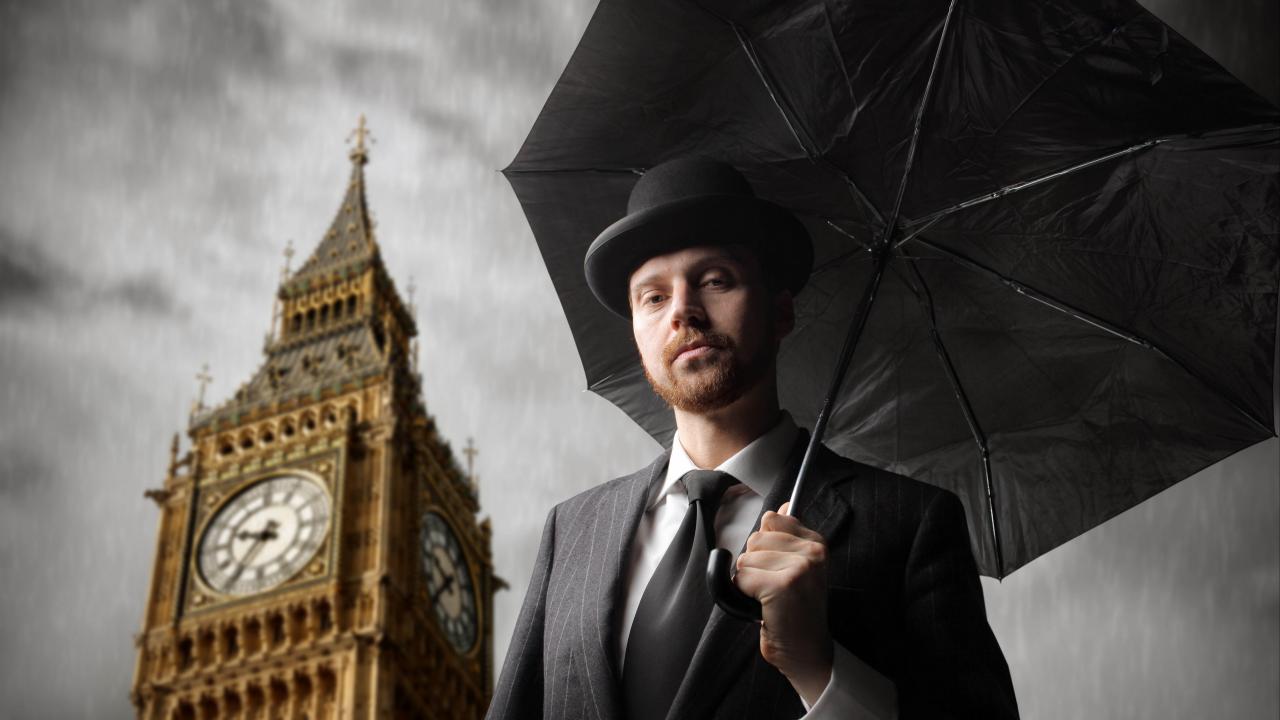 Wallpaper A man in a suit with a black umbrella at the tower with a clock