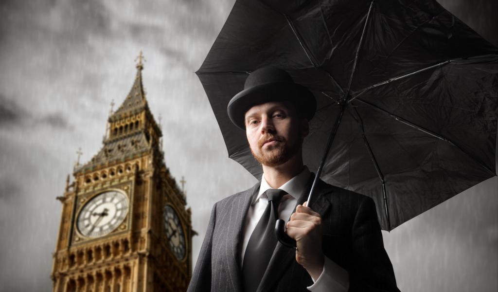 Wallpaper A man in a suit with a black umbrella at the tower with a clock