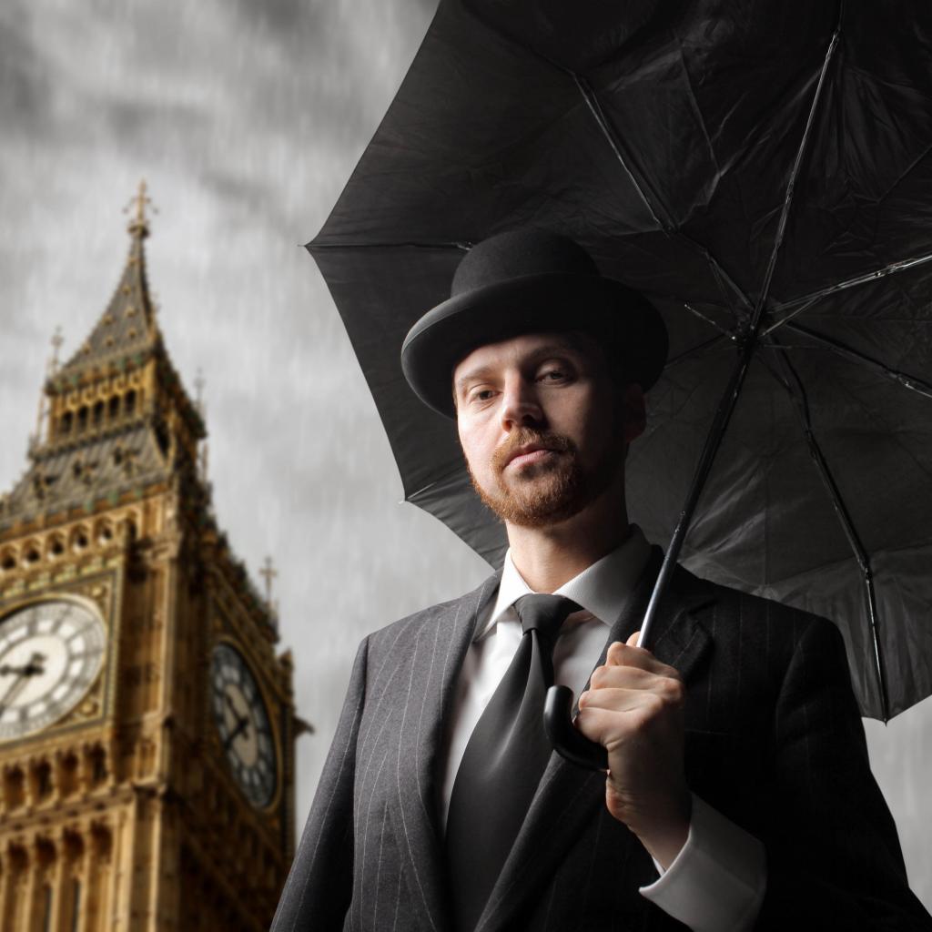 Wallpaper A man in a suit with a black umbrella at the tower with a clock