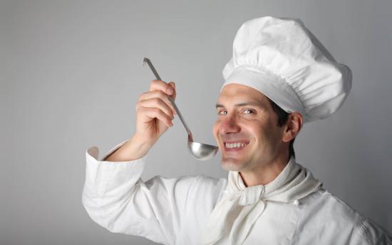 Wallpaper Smiling male cook with a ladle in his hands on a gray background