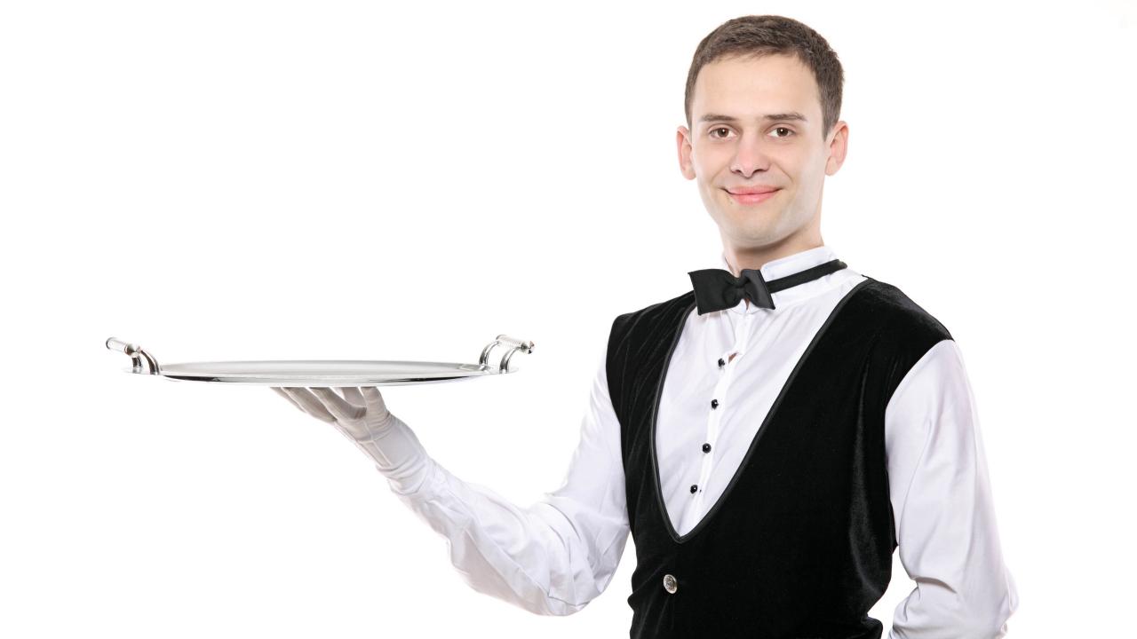 Wallpaper Male waiter with a tray in hand on white background