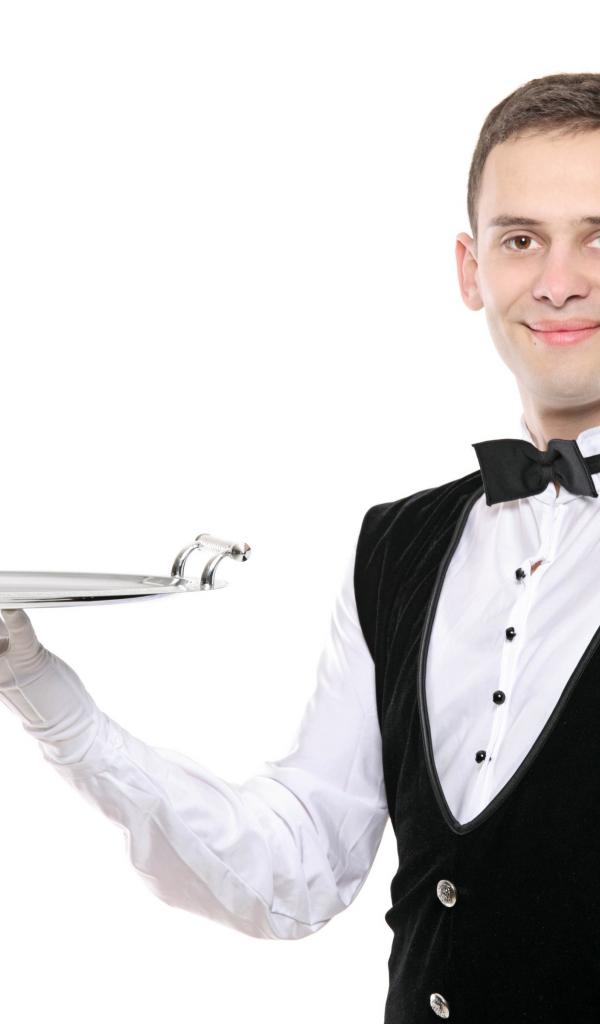 Wallpaper Male waiter with a tray in hand on white background