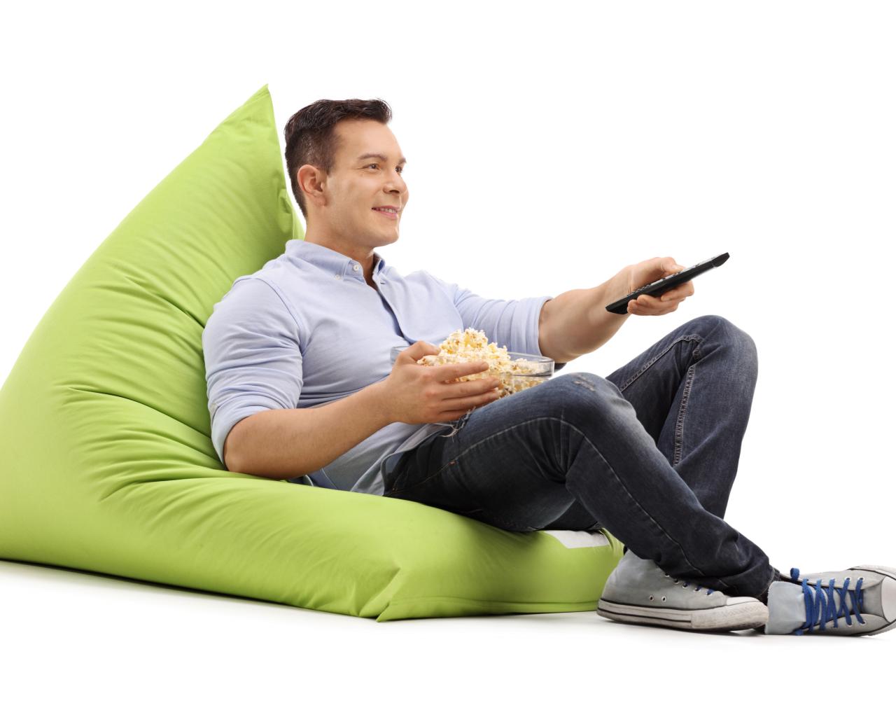 Wallpaper A man with popcorn and a TV remote is lying on a green pillow