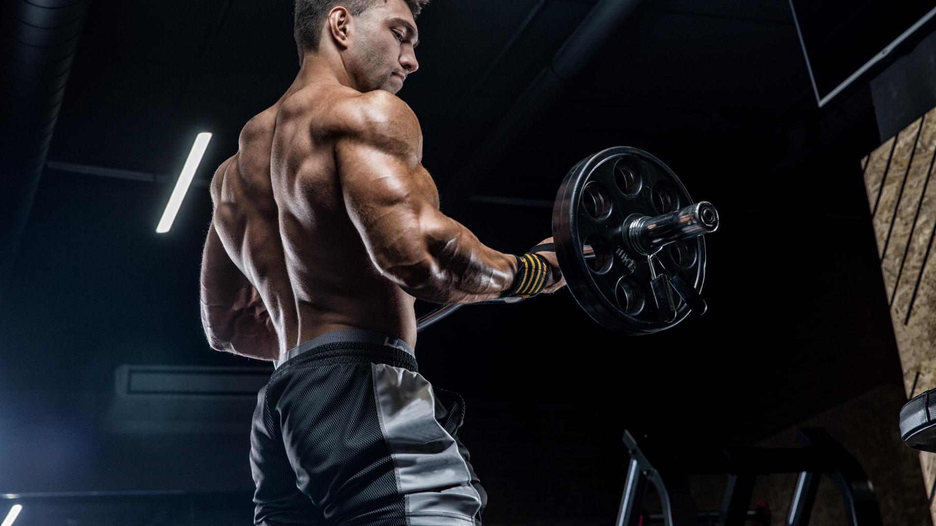 Wallpaper Athletic sporty man with a barbell in his hands