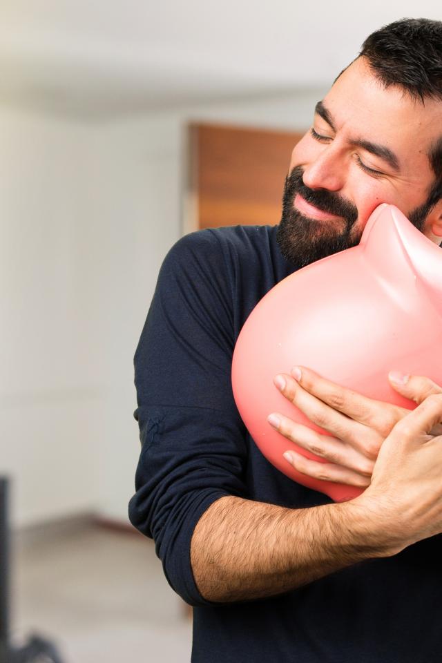 Wallpaper Man hugging a pink pig piggy bank