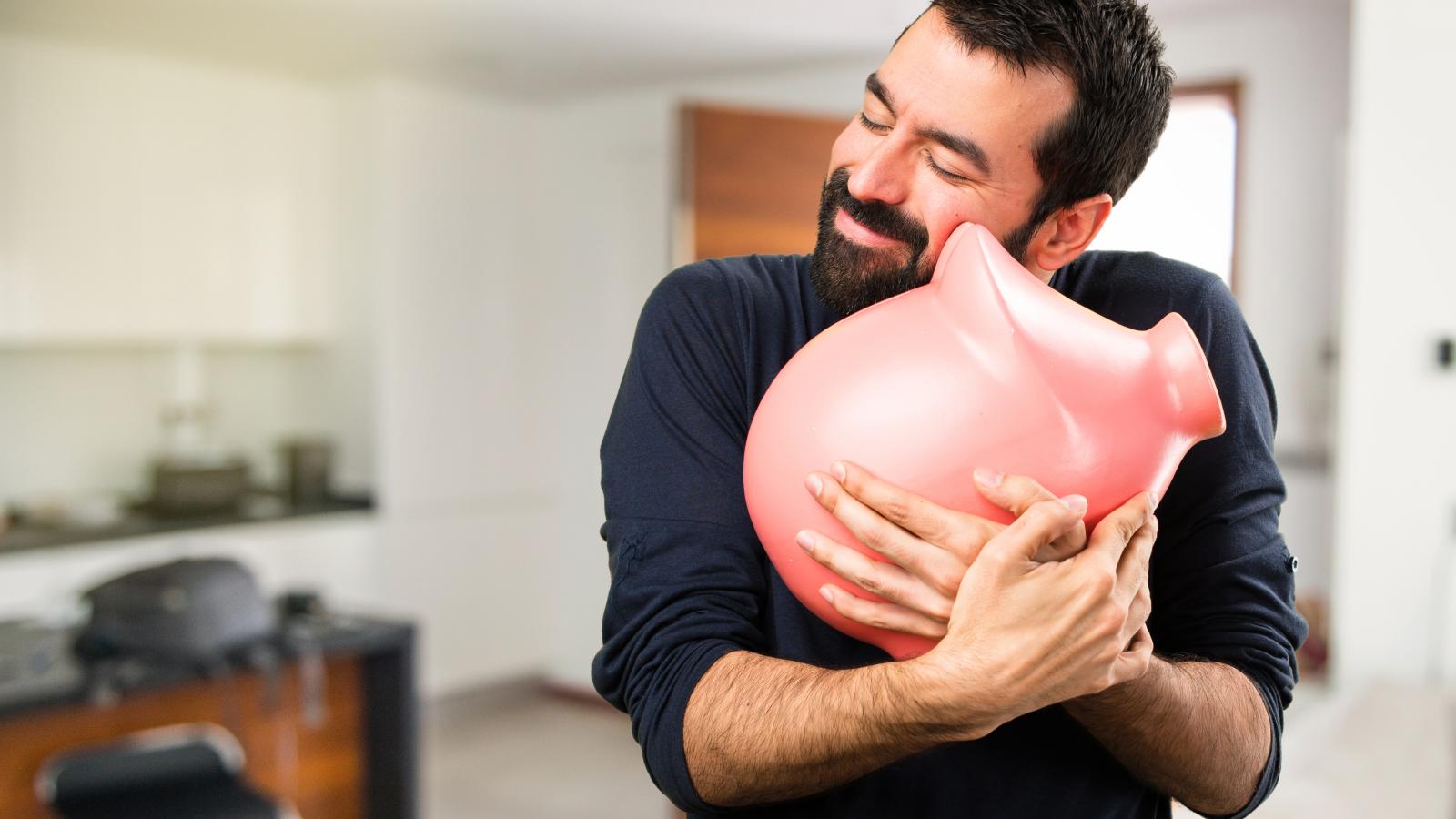 Wallpaper Cheerful girl in glasses with a piggy bank in hands on a white background