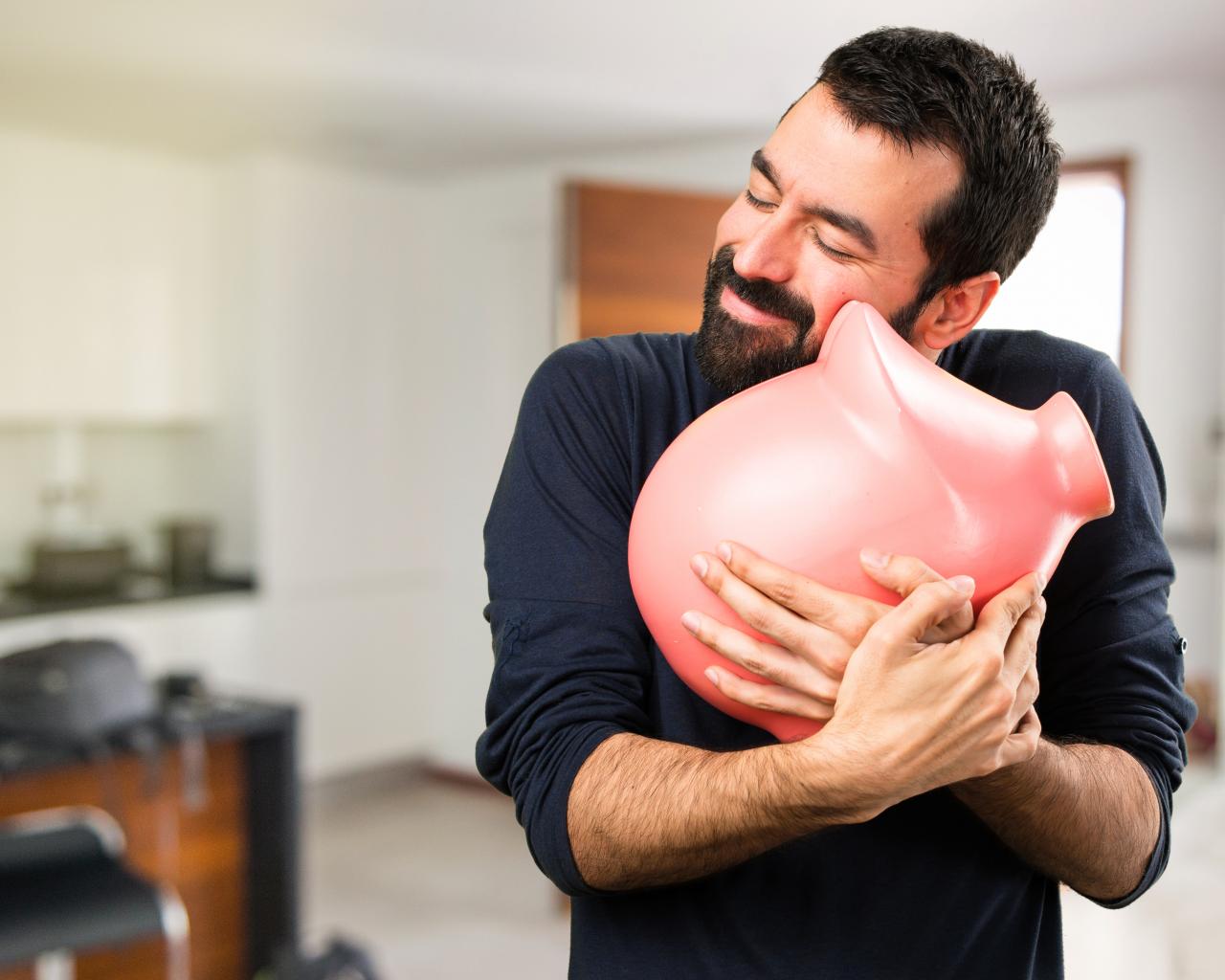 Wallpaper Cheerful girl in glasses with a piggy bank in hands on a white background