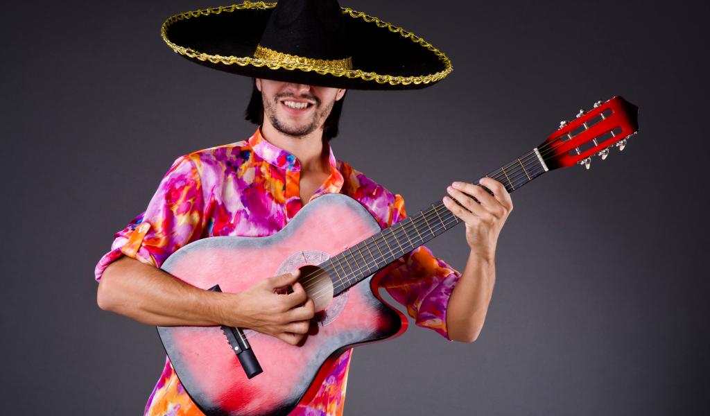 Wallpaper A man in a sombrero with a guitar in his hands on a gray background