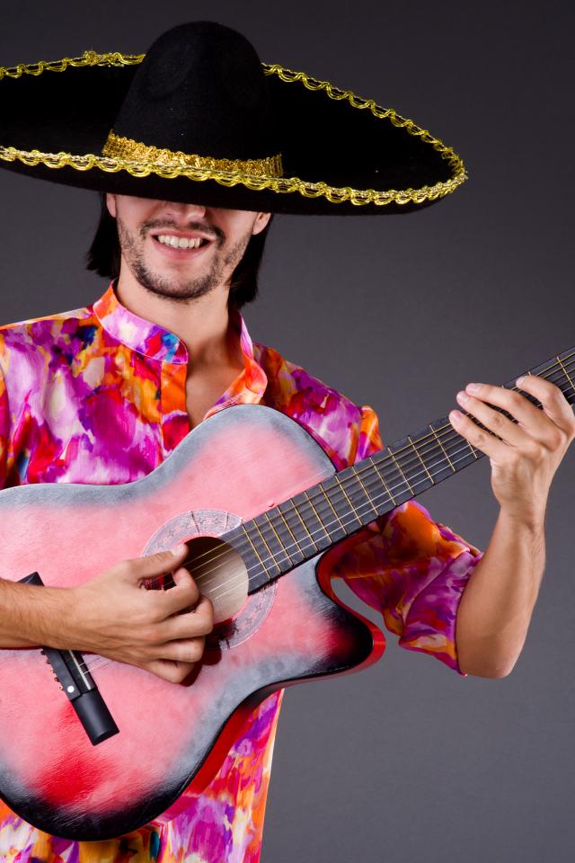 Wallpaper A man in a sombrero with a guitar in his hands on a gray background