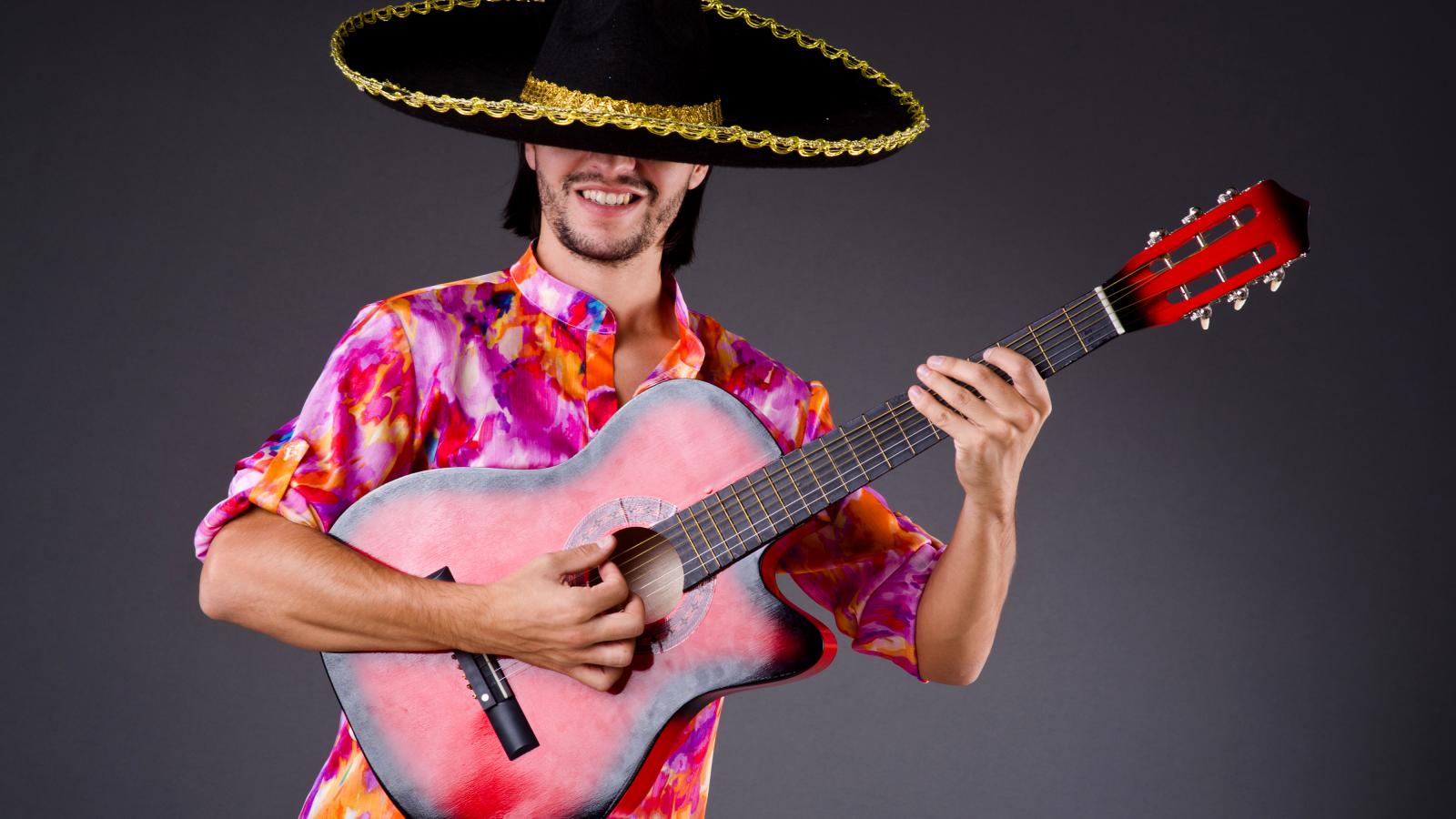 Wallpaper A man in a sombrero with a guitar in his hands on a gray background