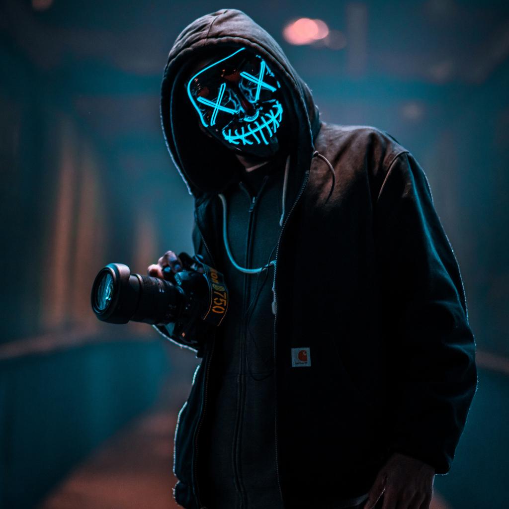 Wallpaper A guy in an anonymous neon mask with a camera