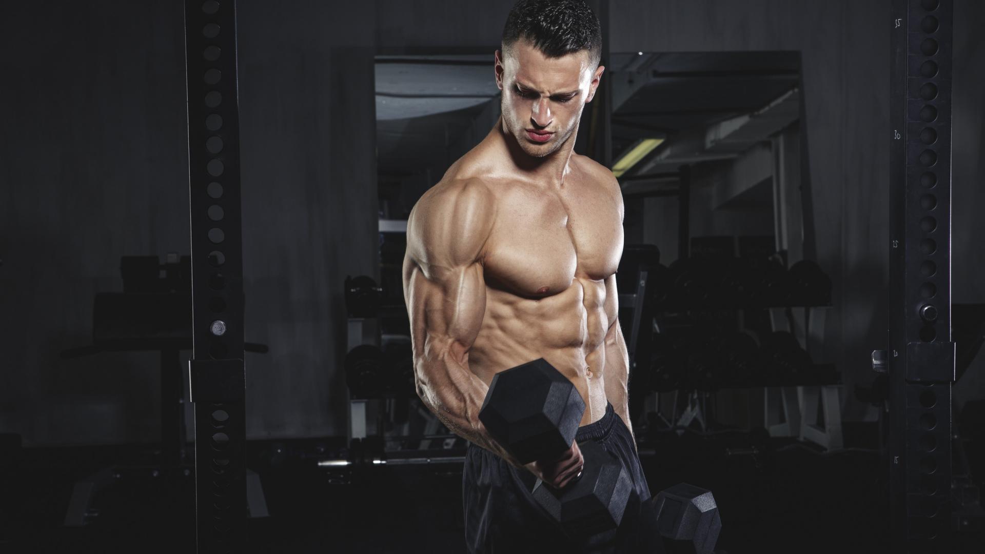 Wallpaper Inflated man with heavy dumbbells in his hands